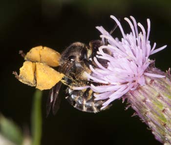 Da die Ölblumen keinen Nektar liefern, ist das Weibchen von Macropis europaea gezwungen, zwischendurch Nektar zu trinken, hier an einer Acker-Kratzdistel (Cirsium arvense). Beachte die mächtigen Pollen-Öl-Ladungen.