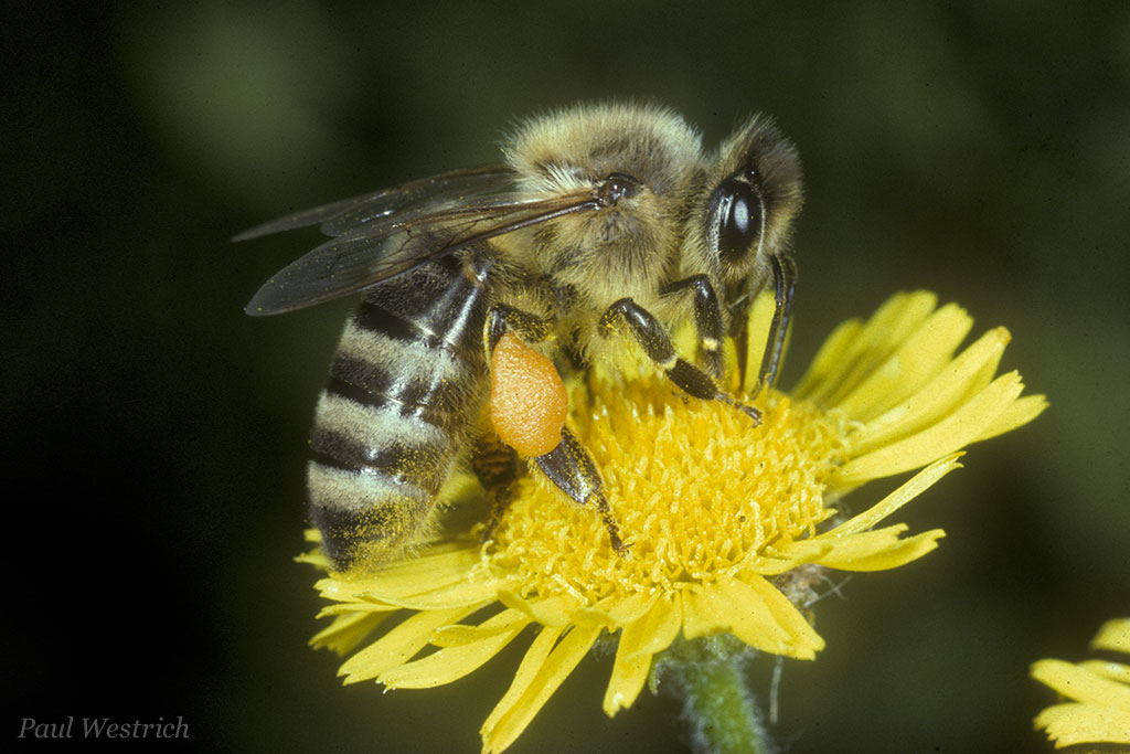 Die Honigbiene ist nur eine von weltweit über 17000 Bienenarten und nur eine von rund 560 Arten in Deutschland. Sie ist innerhalb der Bienen in vielerlei Hinsicht eine große Ausnahme und deshalb nicht repräsentativ für die Bienen. Hier auf Flohkraut (Pulicaria dysenterica).