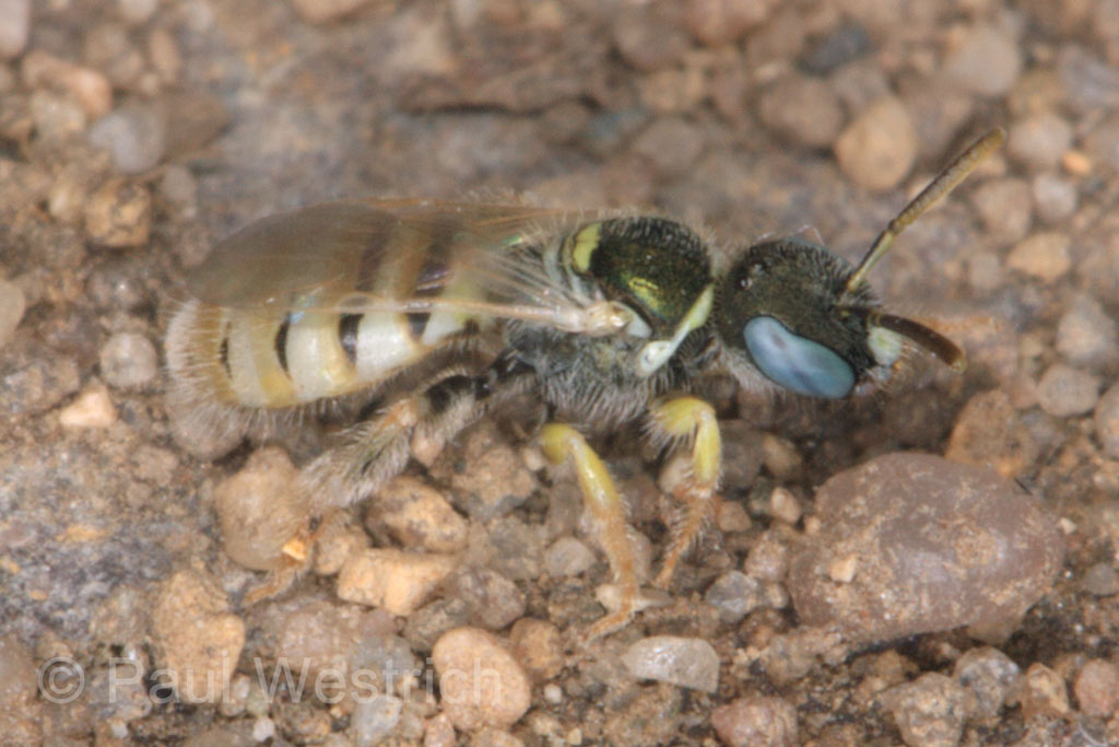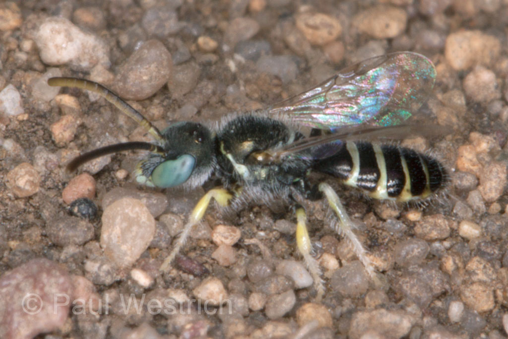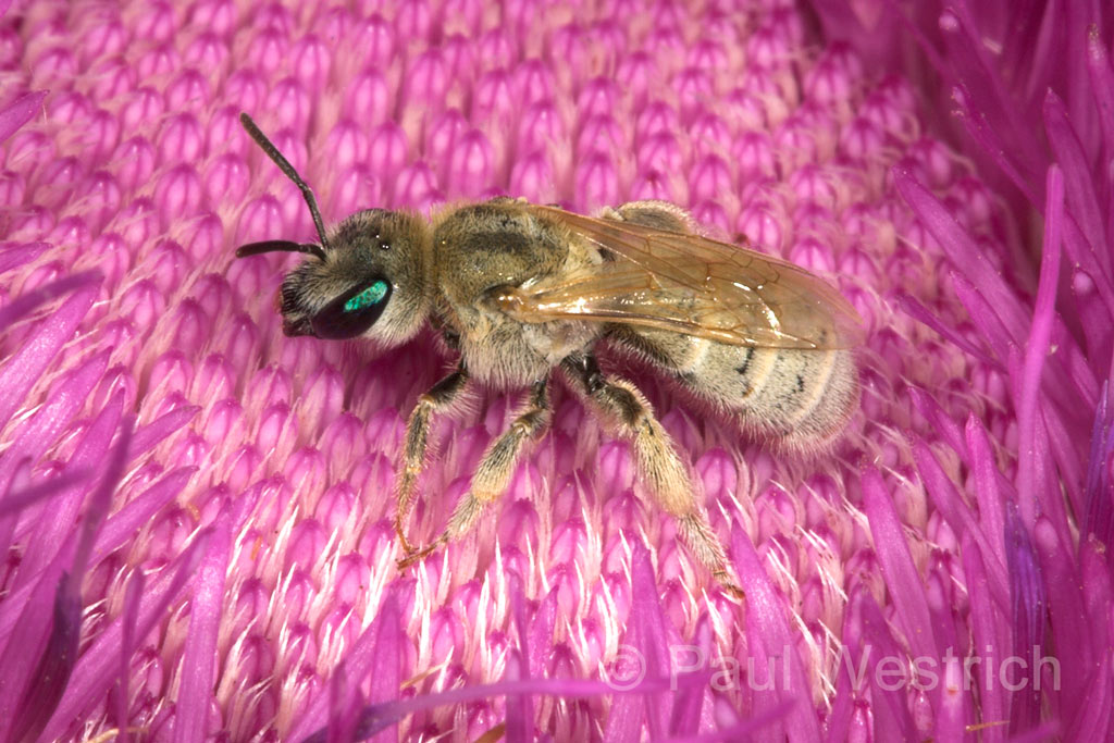 Einige Wildbienen haben grüne Komplexaugen und ihr Körper sieht wie mit Puder bestäubt aus.