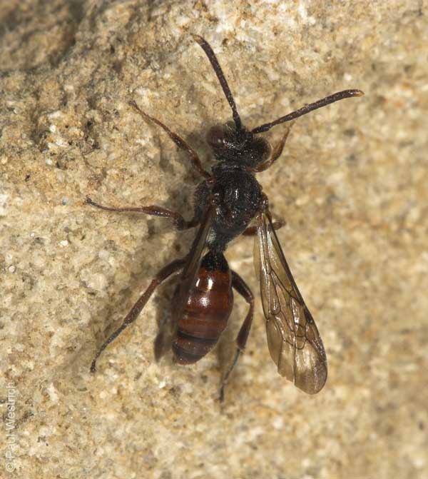 Das Foto zeigt das nur 5-7 mm große Weibchen von Nomada discedens.
