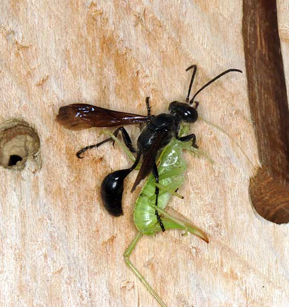 Familie Königer (Emmendingen) gab mir freundlicherweise die Gelegenheit, in ihrem strukturreichen Garten »ihre« Isodontia mexicana zu beobachten und zu fotografieren. Dafür sei ihr auch an dieser Stelle recht herzlich gedankt. Die heutigen Beobachtungen bestätigen die Befunde vom 2. September 2009. Sie werden mit Fotos zum Nestbau und zum Beuteeintragen sowie mit Notizen über eine mögliche 2. Generation ergänzt.