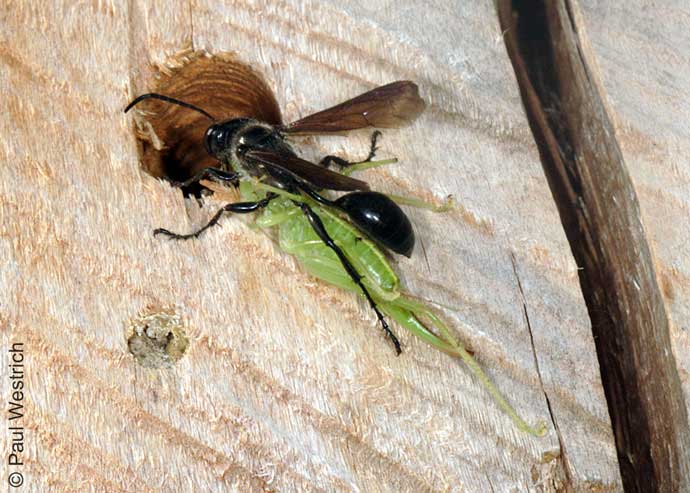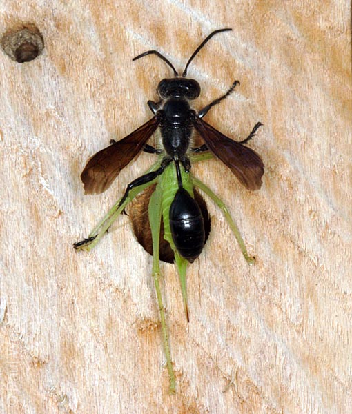 Nach dem Deponieren des oben zu sehenden Beutetiers in dem Gang dauerte es 10 Minuten, bis die Grabwespe wieder aus dem Nestgang herauskam. Da sie anschließend sofort mit einem Grasblatt zurückkam und daher mit dem Verschließen des Nestes begann, ist anzunehmen, daß auf die Eichenschrecke ein Ei abgelegt wurde und daß eine einzige ausgewachsene Heuschrecke für einen Nachkommen, vermutlich ein Männchen, ausreicht. Wenn in andere Zellen drei und mehr Eichenschrecken eingetragen wurden, wie Herr Königer beobachtet hat, dann kann man davon ausgehen, daß sich in einer solchen Zelle ein Weibchen entwickelt.