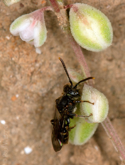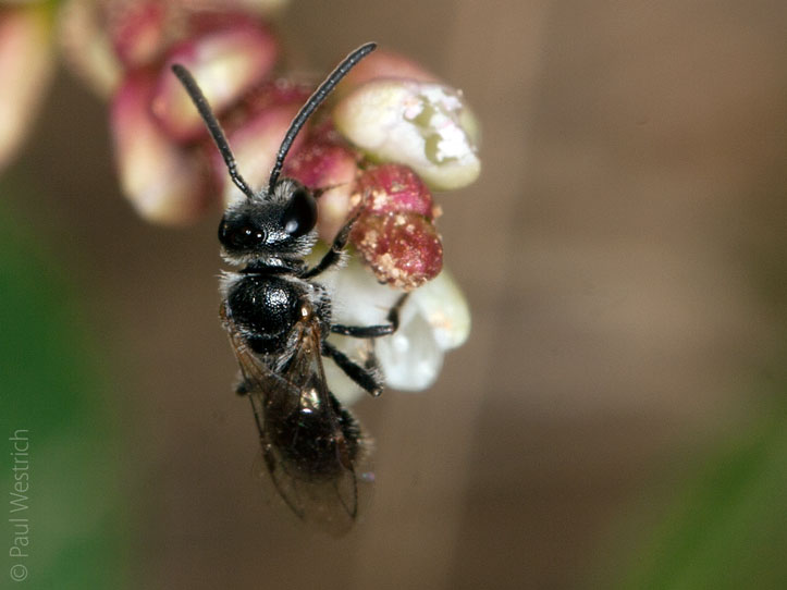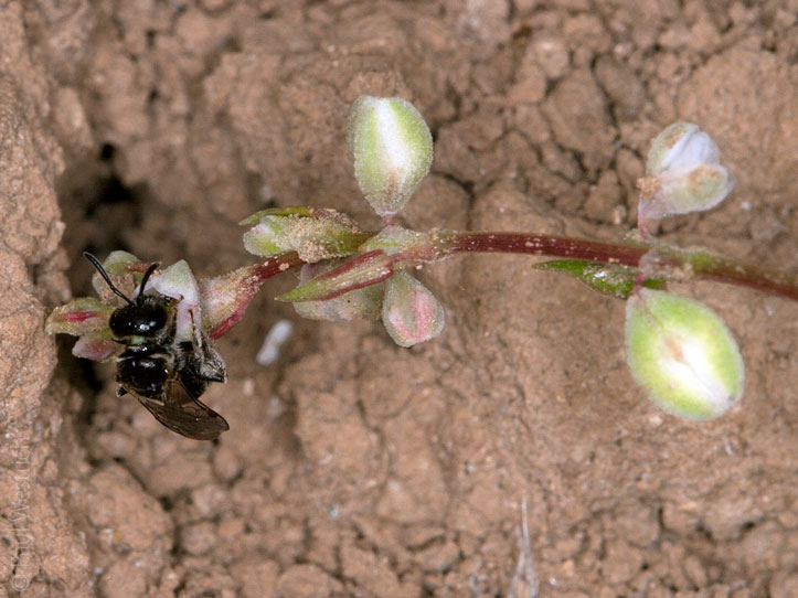 Heute habe ich den Bestand erneut kontrolliert. Mein primäres Ziel war es, Männchen zu finden, da diese als Nachweis für den diesjährigen Bruterfolg gelten können. Ich konzentrierte meine Suche auf die Stellen, wo ich bereits im Mai und Juni Weibchen beobachtet hatte. Schon nach kurzer Zeit sah ich das erste Männchen. Mir fiel auf, daß es nach der Inspektion eines Nesteinganges zum Fuße einer kleinen Steilwand flog, wo der Gewöhnliche Windenknöterich (Fallopia convolvulus) in Anzahl wuchs und blühte. Als ich sah, daß das Männchen sich an den winzigen Blütchen mit Nektar verköstigte, versuchte ich, seine Blütenbesuche mit der Kamera festzuhalten. Bald sah ich noch weitere Bienchen an den Blüten. Die Ergebnisse meiner Beobachtungen habe ich nachfolgend dokumentiert.