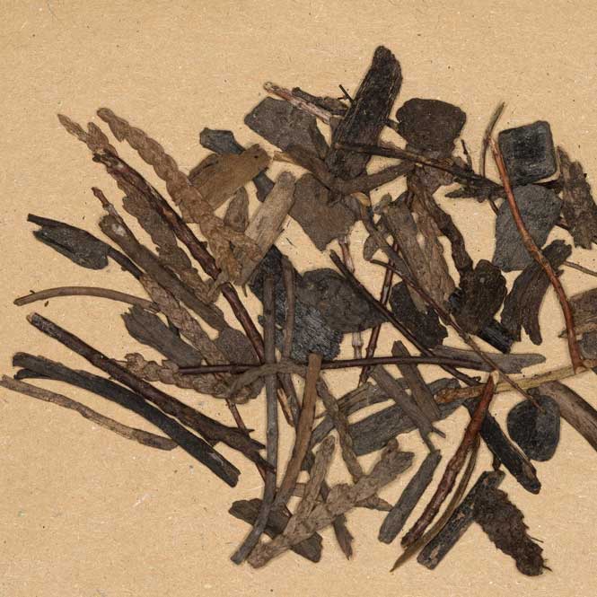 Die folgenden sechs Bilder zeigen stark vergrößert, welche unterschiedlichen Kleinteile von dem Weibchen in das Häuschen für den Schutzwall eingetragen wurden.