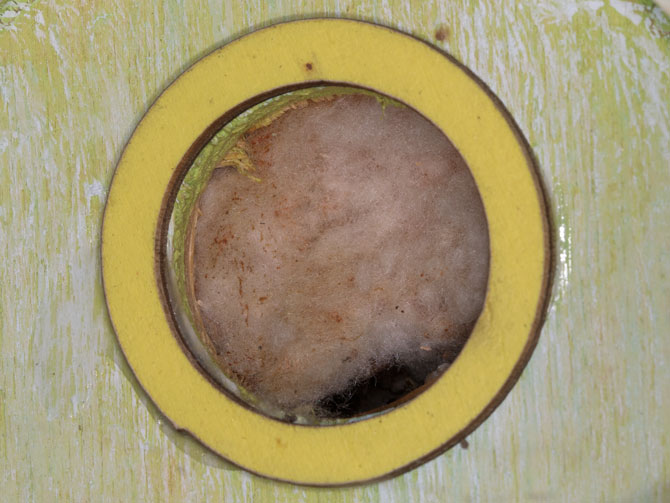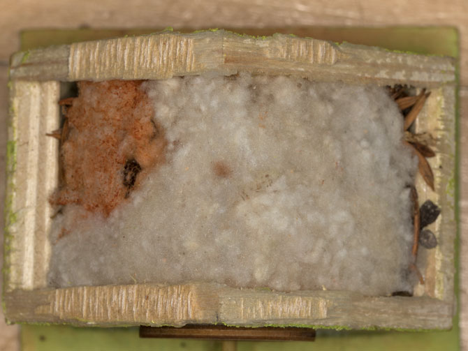 Das Deko-Vogelhäuschen maß nur 10x7cm. Wie mir einige Leser berichteten, erweckte die Abbildung in der Zeitung den Eindruck, es sei deutlich größer. In der runden, 2 cm weiten Eingangsöffnung ist ein Teil des Nestes aus Pflanzenhaaren zu sehen mit den charakteristischen rostroten Flecken, die von dem Aufbringen eines pflanzlichen Drüsensekret herrühren (siehe die Tagebuchnotizen auf dieser Seite) [Bild 1]. Vor dem Häuschen lag ein kleiner »Berg« von Kleinteilen: Erdbröckchen von einem nur wenige Meter entfernten Beet, dürre Nadeln einer auf diesem Beet wachsenden Eibe, Steinchen, Holzstückchen, winzige, teilweise zerbrochene Häuschen einer Schließmundschnecke [Bild 2]. Nachdem ich das Dach entfernt hatte, fand ich unmittelbar darunter das Nest, das nur auf einer Seite mit Drüsensekreten versehen war (rostroter Teil) [Bild 3]. In diesem Teil des Nestes lagen zwei Kokons, aus denen die Bienen aber bereits geschlüpft waren [Bild 4]. Die genauere Untersuchung der Kokons ergab, daß es sich um Kokons von Anthidum manicatum, der Wollbiene also, handelte, nicht um solche der bei ihr schmarotzenden Düsterbiene Stelis punctulatissima, die eine andere Form haben. Da das Nest im Juli aufgrund der angehäuften Erdbröckchen etc. entdeckt wurde und letztere nach Aussage von Doris Haug im Frühling noch nicht vorhanden waren, kann das Nest nur von 2015 stammen. Daß die Wollbienen noch im gleichen Sommer geschlüpft sind, ist ein weiterer Beleg für die schon früher von mir geäußerte Vermutung, daß Anthidium manicatum zumindest partiell in einer 2. Generation auftritt.