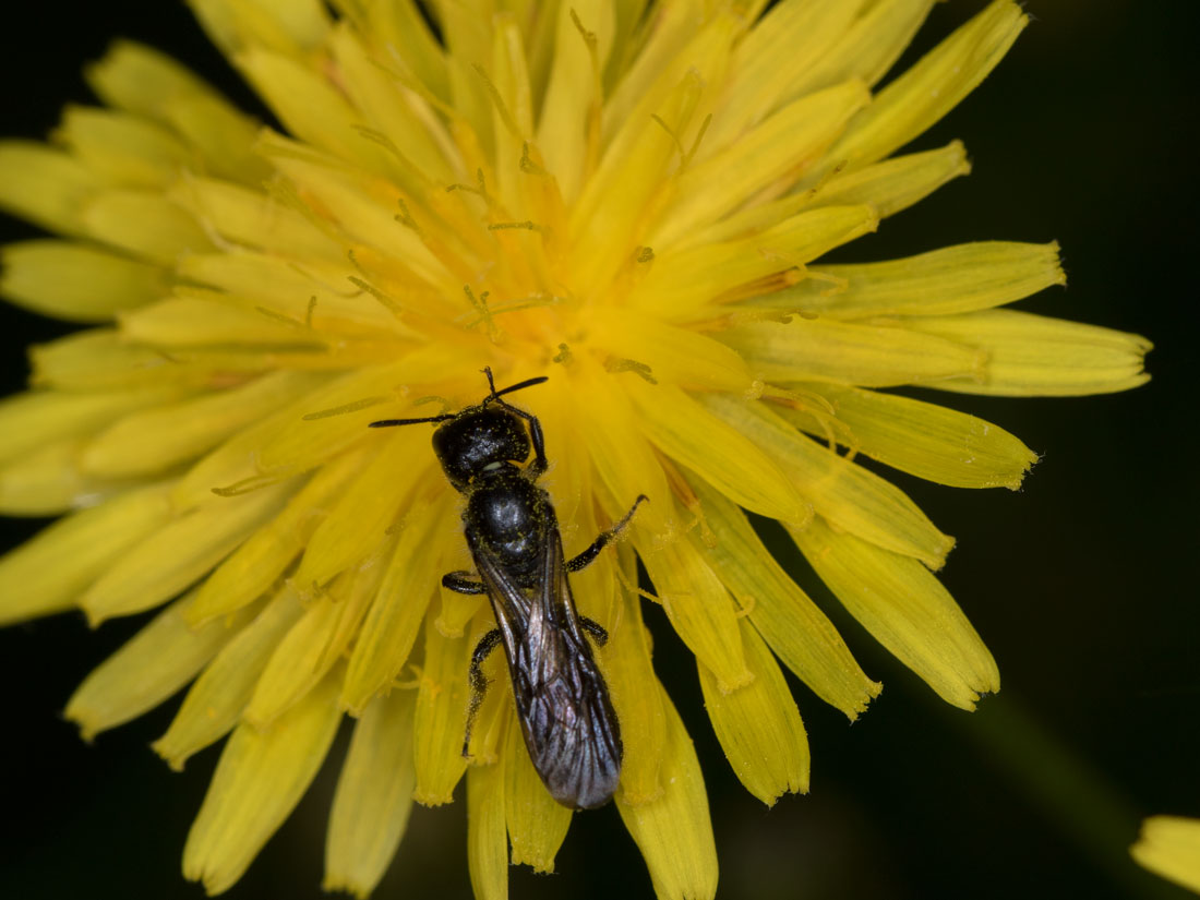 Chelostoma florisomne: 1 Weibchen. Diese Scherenbienenart ist zwar auf Hahnenfuß (Ranunculus) spezialisiert, besucht aber gelegentlich auch andere Pflanzenarten als Nektarquelle.