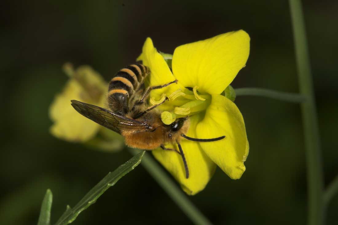 Der Schmalblättrige Doppelsame, auch Wilde Rauke genannt, gehört zur Pflanzenfamilie der Kreuzblüter (Brassicaceae), von denen einige Arten zu den von Wildbienen häufig besuchten Pflanzen zählen. Unter dem Namen Rucola wird diese Pflanze gehandelt und als Salat und Gewürzkraut verwendet. Der ausdauernde krautige Kreuzblütler wird 20 bis 70 cm hoch. Sein traubiger Blütenstand enthält zahlreiche schwefelgelbe Blüten. Die Blüten weisen sechs Staubblätter mit 4 bis 8 mm langen Staubfäden und 2.5 bis 3 Millimeter lange Staubbeutel auf. Die Blüten verströmen einen intensiven Duft. Ob man sie als »wohlriechend« wie Knuth (1898) bezeichnen kann, sei dahingestellt. Es gibt vier Nektardrüsen, von denen nur die zwei kleineren, die innen am Grunde der beiden kürzeren Staubblätter stehen, Nektar absondern. Die kürzeren Staubblätter wenden die aufgesprungenen Seiten ihrer Antheren nach innen, die Antheren der längeren sind den kürzeren zugekehrt (Knuth 1898).