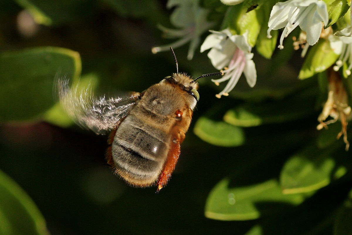 Die ersten mir bekannt gewordenen und zudem ausgezeichneten Lebendfotos dieser Art hat Gisela Nagel am 16. März 2019 bei Las Casitas auf Lanzarote aufgenommen und bei Flickr neben anderen Insekten und eindrucksvollen Aufnahmen von Vögeln auch ein Männchen beim Blütenbesuch eingestellt*. Frau Nagel hat mir freundlicherweise erlaubt, die beiden Fotos hier zu präsentieren. Ein Klick auf ein Foto zeigt eine Großansicht der Pelzbiene.