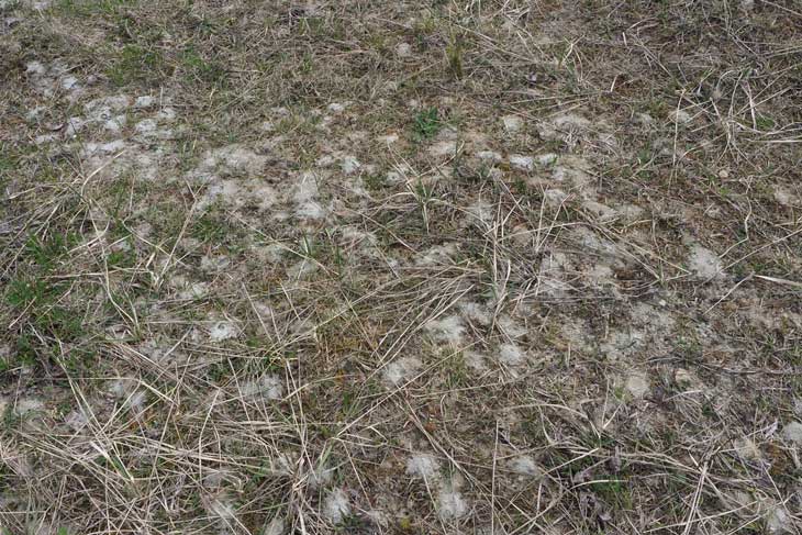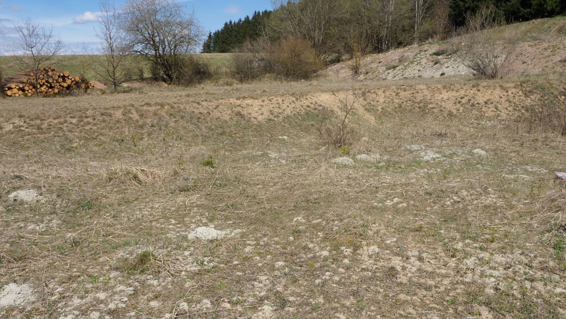 Andrena vaga besiedelt häufig Sand- und Kiesgruben, aber auch aufgelassene Lehmgruben (Donautal bei Ehingen, 11. April 2021). Eine Kolonie mit zahlreichen Auswurfhügelchen ist im Vordergrund zu sehen. [Für Großansicht auf Bild klicken]