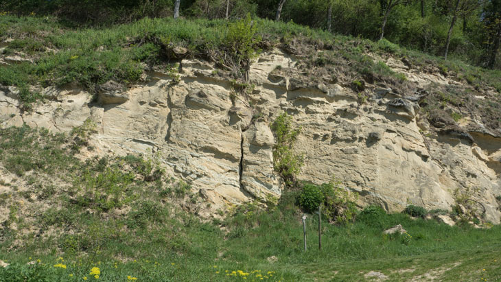 Eine Molassewand im Markgräfler Land (Baden-Württemberg). In dem vergleichsweise weichen Sandstein nisten alljährlich mehrere hundert Weibchen von Colletes daviesanus, aber auch andere Steilwandbewohner wie die Schmalbienenart Lasioglossum limbellum.