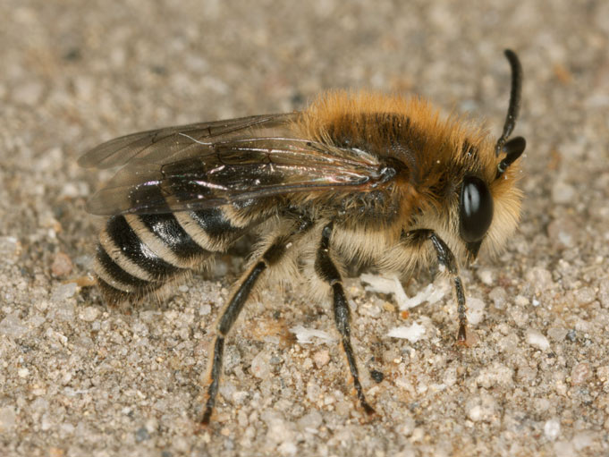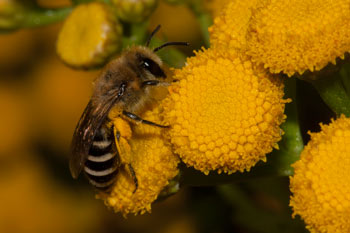 Mit Rainfarn-Pollen gut beladen kehrt das Weibchen zu seinem Nest in der Steilwand zurück.