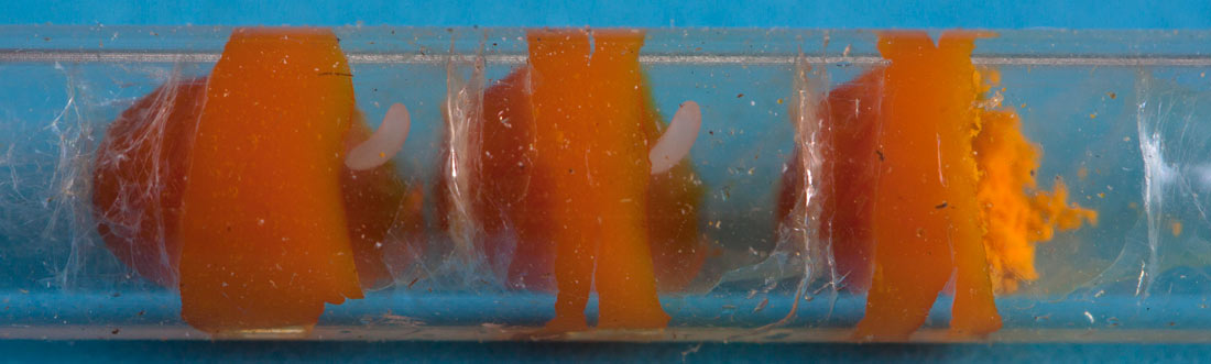 Ein Nest von Colletes daviesanus mit mehreren Brutzellen in einer zur Beobachtung hergerichteten, hölzernen Nisthilfe. Die Larven haben ihr Futter bereits aufgefressen.