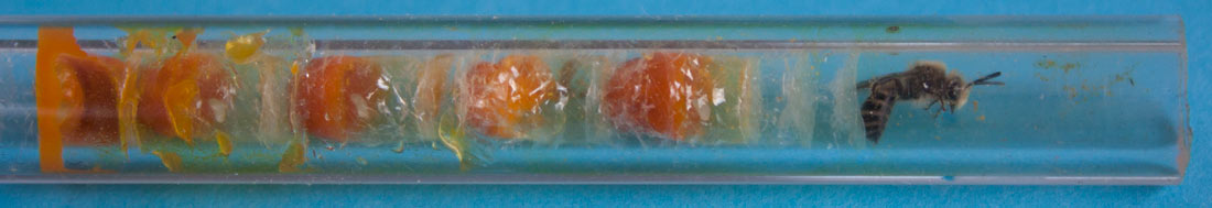 Ebenfalls ein Nest in einem Acrylglasröhrchen. In den linken, zuerst versorgten Brutzellen wurde auf das nektarreiche Futter bereits ein Ei abgelegt. In der vorderen Zelle wurde gerade frischer Pollen deponiert. Beim nächsten Heimkommen wird das Weibchen auch Nektar hinzugeben. [Großansicht]