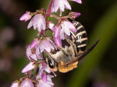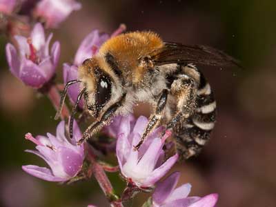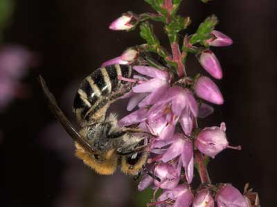 Polylektische Art, mit deutlicher Bevorzugung von Ericaceae (Heidekrautgewächse). Hauptpollenquelle ist das Heidekraut (Calluna vulgaris), daneben wird aber auch die Graue Glockenheide (Erica cinerea) besucht. – Die Weibchen sind offenbar in der Lage, auch andere Pollenquellen zu nutzen (Müller & Kuhlmann 2008). In Pollenladungen in Anteilen unter 5% nachgewiesen wurden Asteraceae (Asteroideae, Cichorioideae), Apiaceae und Efeu (Hedera). In England sammeln die Weibchen lokal ausschließlich an Asteraceae und mehrere Weibchen wurden beim Blütenbesuch an Hedera beobachtet (Kuhlmann et al. 2007). Das Pollensammeln beginnt ab einer Lufttemperatur von 15 °C um ca. 10 Uhr und erreicht seine höchste Aktivität in den Nachmittagsstunden. Eine Pollenladung hat ein Gewicht von ca. 5,9 mg (Kribbe 1996).