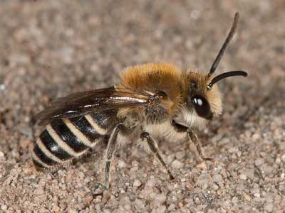 Colletes succinctus besiedelt vorwiegend Sandheiden wie hier im Oberrheinischen Tiefland in einem Flugsandgebiet bei Heidelberg mit einem großen Bestand des Heidekrauts (Calluna vulgaris). [Für Großansicht auf Bild klicken]