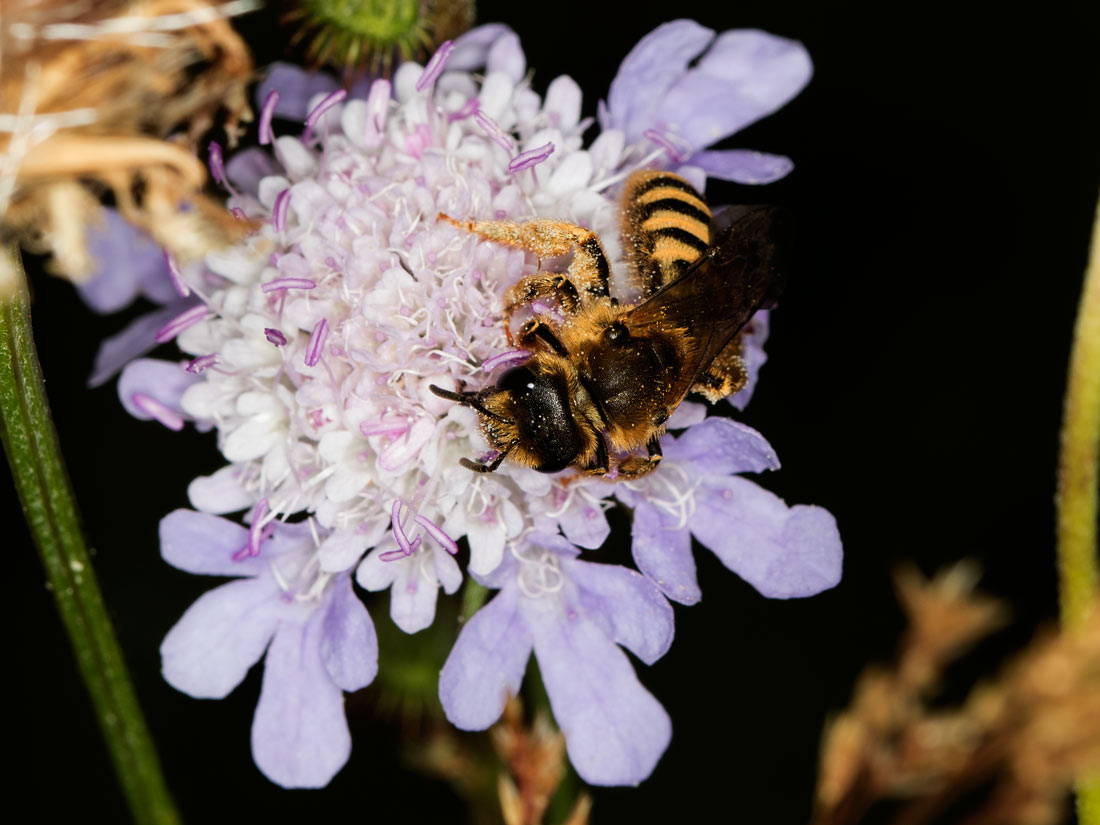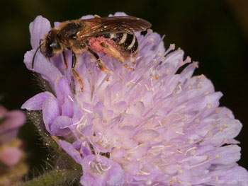 Die für Witwenblumen typische Pollenfarbe Rosa in den Speicherorganen von Halictus scabiosae belegt die Pollenernte an der Wiesen-Witwenblume (Knautia arvensis).