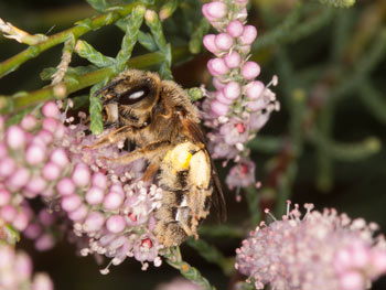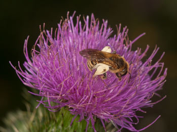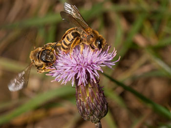 Die Gewöhnliche Kratzdistel (Cirsium vulgare) produziert weißen Pollen, der hier von einem Weibchen von Halictus scabiosae reichlich geerntet wird.