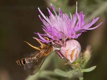 Ein Blütenbesuch birgt auch Risiken: Hier hat eine Krabbenspinne ein Männchen von Halictus scabiosae erbeutet.