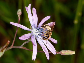 Halictus scabiosae, Weibchen bei der Pollenernte im Blütenstand des Blauen Lattichs (Lactuca perennis).