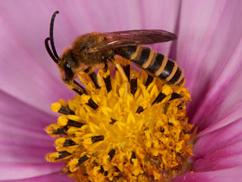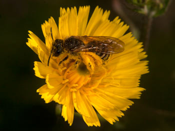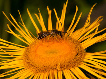Halictus scabiosae, Weibchen bei der Pollenernte auf Gewöhnlichem Bitterkraut (Picris hieracioides). Die Funktion der Behaarung auf der Unterseite des Hinterleibs als Pollenspeicher ist gut sichtbar.