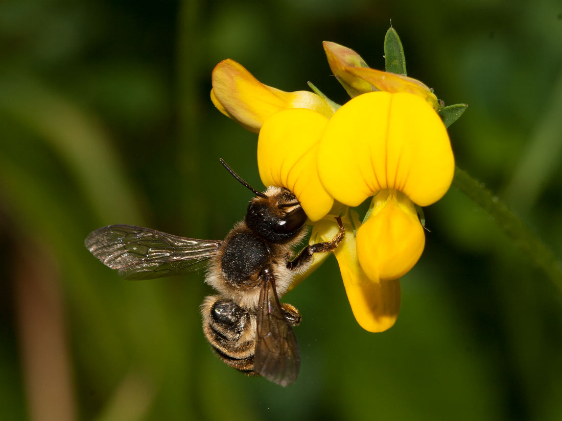 Weibchen von Megachile ericetorum bei der Pollenernte am Gewöhnlichen Hornklee (Lotus corniculatus).