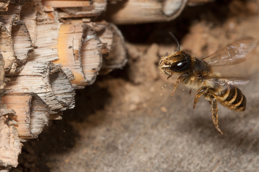 Ein Weibchen von Megachile ericetorum mit pollengefüllter Bauchbürste im Anflug an das Nest in einem Bambusröhrchen.