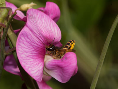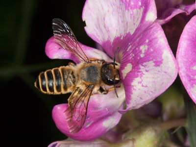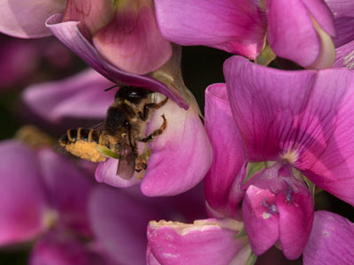 Megachile ericetorum, Weibchen bei der Pollenernte an der Breitblättrigen Platterbse (Lathyrus latifolius).