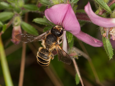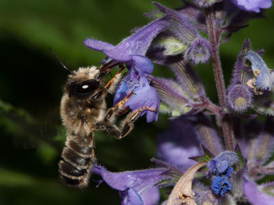 Sehr vereinzelt werden auch Lamiaceae (Lippenblütler) als Pollenquellen genutzt (Analyse von Pollenladungen). – Die Weibchen verhalten sich meist blütenstet, wenn sie an Lotus oder Lathyrus sammeln. Gleiches gilt für Ononis. Da aber Ononis keinen Nektar bietet, enthalten die Ononis-Pollenladungen in geringer Menge (1–5 %) Pollen eines Nektar bietenden Schmetterlingsblütlers, z. B. Lathyrus. Die Männchen patrouillieren oft Blütenstände von Lamiaceen, z. B. vom Aufrechten Ziest (Stachys recta) oder Woll-Ziest (Stachys byzantina). Die Paarung findet beim ersten Nektarbesuch der Weibchen statt, die außer Fabaceae auch Lamiaceae als Nektarquellen besuchen.