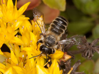 Ein Männchen von Megachile ericetorum trinkt Nektar an einer Blüte von Rhodiola wallichiana (= Sedum crassipes), einer Fetthenne aus asiatischen Gebirgen (Botanischer Garten Tübingen).