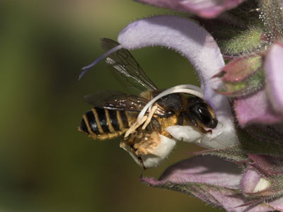 Ein Weibchen von Megachile ericetorum trinkt Nektar in der großen Blüte des Muskateller-Salbeis (Salvia sclarea). Beachte die langen Staubfäden mit den großen Staubbeuteln.