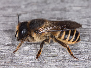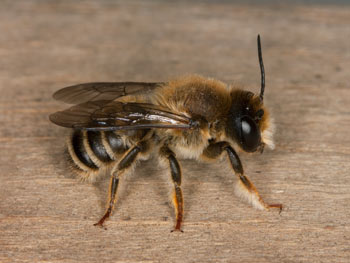 Ein Weibchen beim Verschließen seines Nestes in einer Bohrung eines Holzblocks. Baumaterial: Lehm.