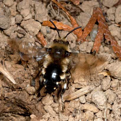 In einer im Frühling kurz vor dem Schlüpfen geöffneten Brutzelle der Wirtsbiene Anthophora plumipes liegt bereits das voll entwickelte, schlüpfbereite Männchen der Kuckucksbiene.