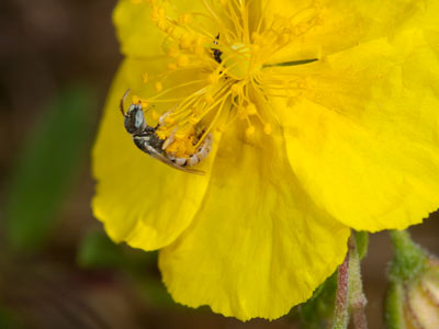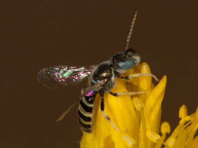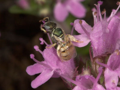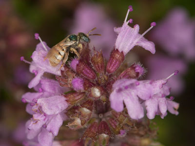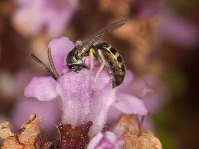 Nomioides minutissimus. Ein Männchen trinkt Nektar in einer Blüte des Sand-Thymians (Thymus serpyllum).