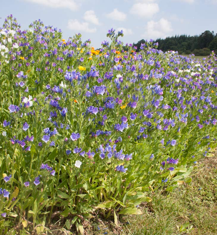 Ein Bestand des Natterkopfs am Rande eines Schotterwegs auf der Schwäbischen Alb.