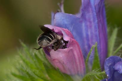 Streng oligolektische, auf Echium (Boraginaceae) spezialisierte Art. Hauptpollenquelle ist nahezu im gesamten mitteleuropäischen Verbreitungsgebiet der Gewöhnliche Natterkopf (Echium vulgare) als meist einziger Vertreter der Gattung Echium. Von den seltenen und unbeständig eingeschleppten Arten Echium plantagineum und Echium italicum ist die erste, meist später als Echium vulgare aufblühende Art als Pollenquelle vielfach belegt und wird eifrig besucht, ganz im Gegensatz zur zweiten, kleinblütigeren Art (Westrich 1990). – Echium vulgare dient gleichzeitig als bevorzugte Nektarquelle für beide Geschlechter. Die Männchen patrouillieren ständig die Blütenstände der Pollenquellen der Weibchen, wobei es regelmäßig zu »Rangeleien« in einer Art Schwebflug auf »Augenhöhe« mit anderen Männchen kommt. Während der Patrouillien setzen sich die Männchen oft auf Steine, dürres Holz oder kahle Bodenstellen als Rastplätze. Natterkopf-Blüten sind auch die häufigsten Nektarquellen der Männchen. Wenn diese noch nicht blühen, nutzen frisch geschlüpfte Männchen Blüten anderer Pflanzenarten zur Eigenversorgung mit Nektar. Aber auch während der Natterkopf-Blüte nutzen beide Geschlechter regelmäßig auch Lippenblütler wie die Garten-Katzenminze (Nepeta faassenii) und Vertreter weiterer Pflanzenfamilien als Nektarquelle. Der hell bläulich-graue Pollen von Echium vulgare wird von den Weibchen trocken in der Bauchbürste transportiert. Durch Zugabe von Nektar erhält der mäßig feuchte Larvenproviant in der Brutzelle eine dunkelviolette Farbe.