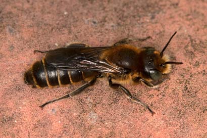 Ein Weibchen sammelt mit ihren Oberkiefern vom Boden Baumaterial für Zellzwischenwand und Nestverschluß.