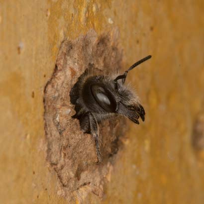 Weibchen beim Fertigen des Nestverschlusses an einer Holznisthilfe.