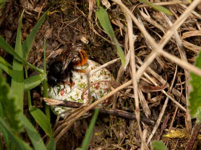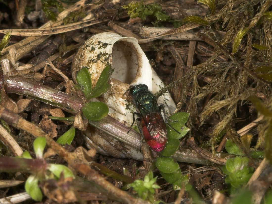 Ein Weibchen der Goldwespe Chrysis trimaculata inspiziert das Schneckenhaus, um in der möglicherweise darin schon angelegten Brutzelle ein Ei abzulegen. Die Goldwespenlarve wird später die ausgewachsene Bienenlarve verzehren.