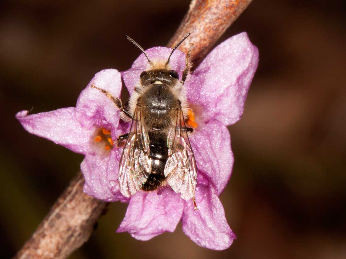 Ein Männchen von Osmia bicolor beim Blütenbesuch am Echten Seidelbast (Daphne mezereum), einem Gehölz des Vorfrühlings (7. April).