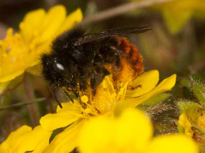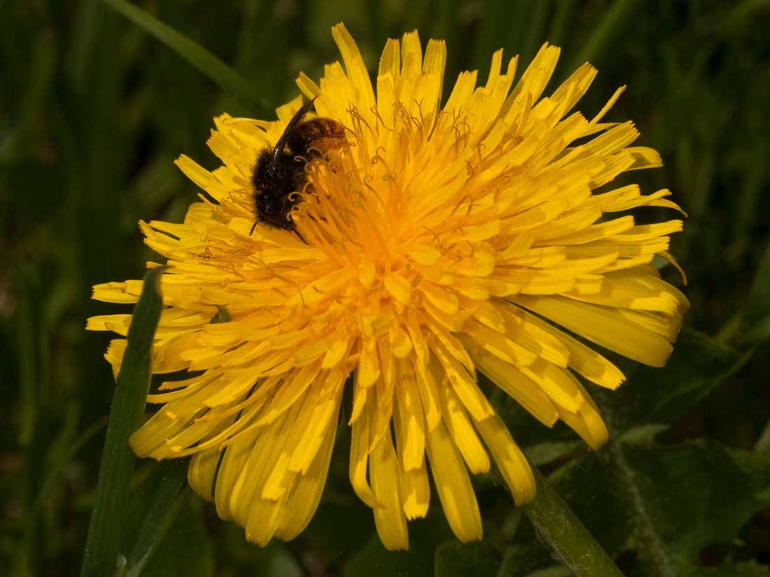 Ein Weibchen von Osmia bicolor bei der Pollenernte auf dem Köpfchen des Wiesen-Löwenzahns (Taraxacum officinale).