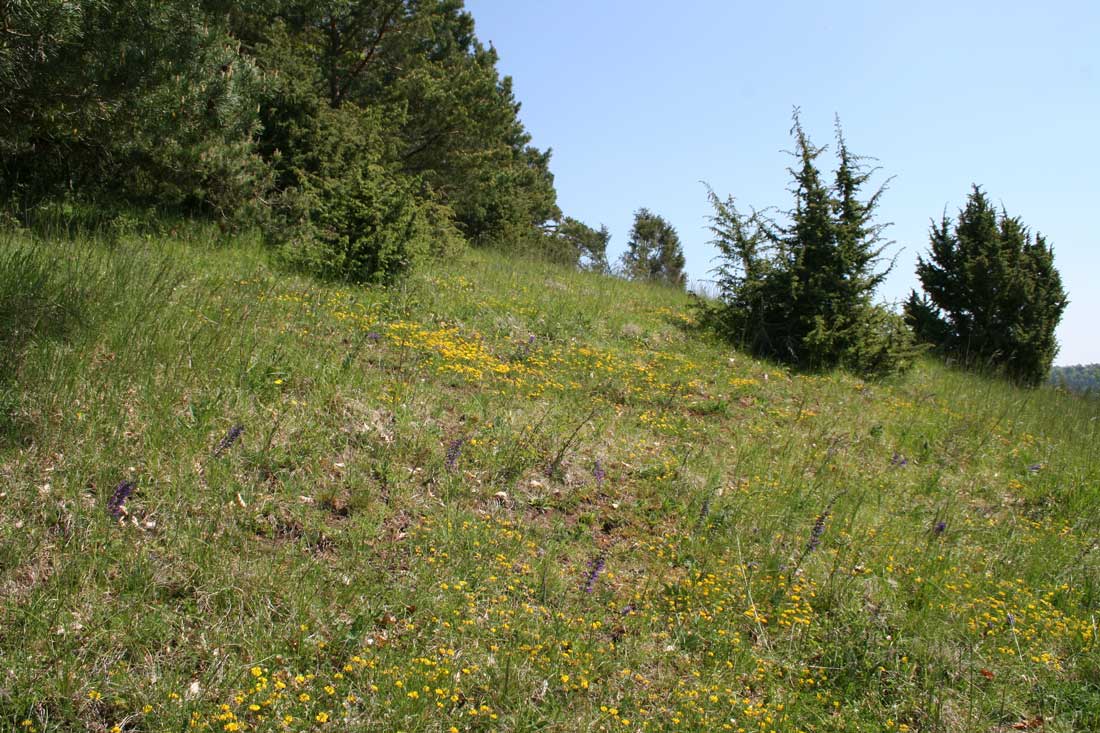 Osmia bicolor besiedelt ein breites Spektrum von Lebensräumen, darunter auch Magerrasen wie hier auf einer Wacholderheide der Schwäbischen Alb. [Für Großansicht auf Bild klicken]