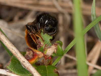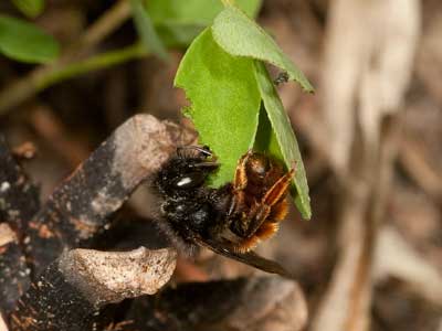 Ein Weibchen von Osmia bicolor beißt kleine Blattstücke ab und verarbeitet sie mit den Oberkiefern zu einem grünen Mörtel.
