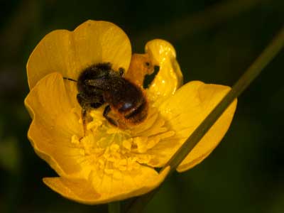 Weibchen sammelt Pollen auf Hahnenfuß (Ranunculus).