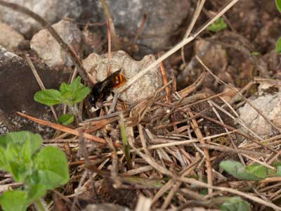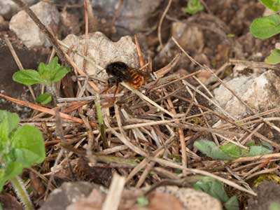 Das Weibchen hat die Brutzelle im Schneckenhaus fertiggestellt und bedeckt nun das Schneckenhaus mit allerlei länglichen Elementen wie dürren Kiefernnadeln, dürren Grashalmen oder Holzstückchen.