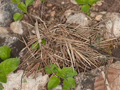 Durch den Streuhaufen aus Grashalmen und Kiefernnadeln ist das Schneckenhaus nicht mehr zu sehen und gleichzeitig geschützt. Erst ein Jahr später wird die Nachkommenschaft schlüpfen und solange muß das Schneckenhaus an dieser Stelle unversehrt überdauern.