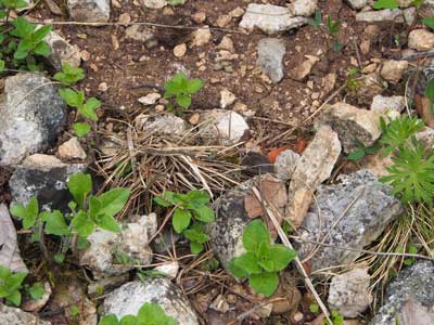 Die für das Nest gewählten leeren Schneckenhäuser (Pfeil) liegen oft in der Vegetation oder unter Grasbüscheln, manchmal aber auch offen.