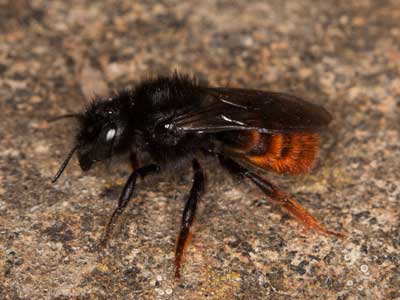 Osmia bicolor. Ein Weibchen beim Nektartrinken am Rauhhaarigen Veilchen.