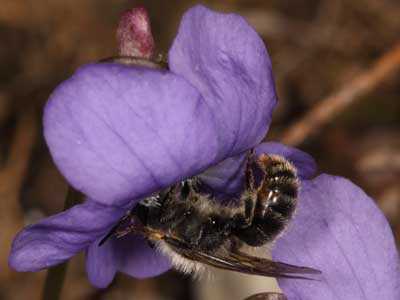 Ein Männchen trinkt Nektar in der Blüte des Rauhhaarigen Veilchens (Viola hirta) (7. April).