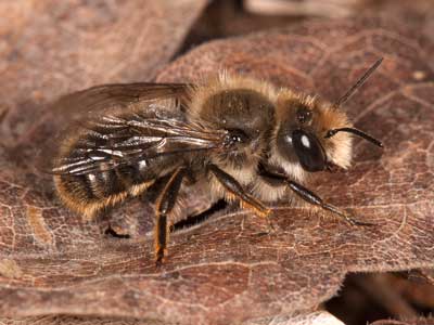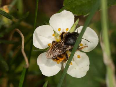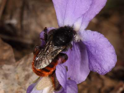 Osmia bicolor. Ein Weibchen beim Nektartrinken am Veilchen.