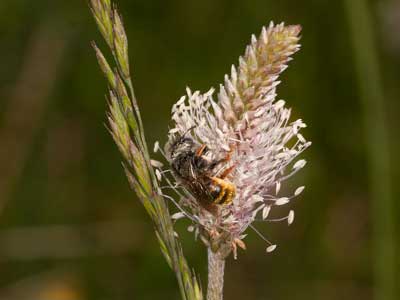 Die ausgesprochene Polylektie von Osmia bicolor wird auch dadurch sichtbar, daß wie hier ein Weibchen auch am Mittleren Wegerich (Plantago media) Pollen sammelt.